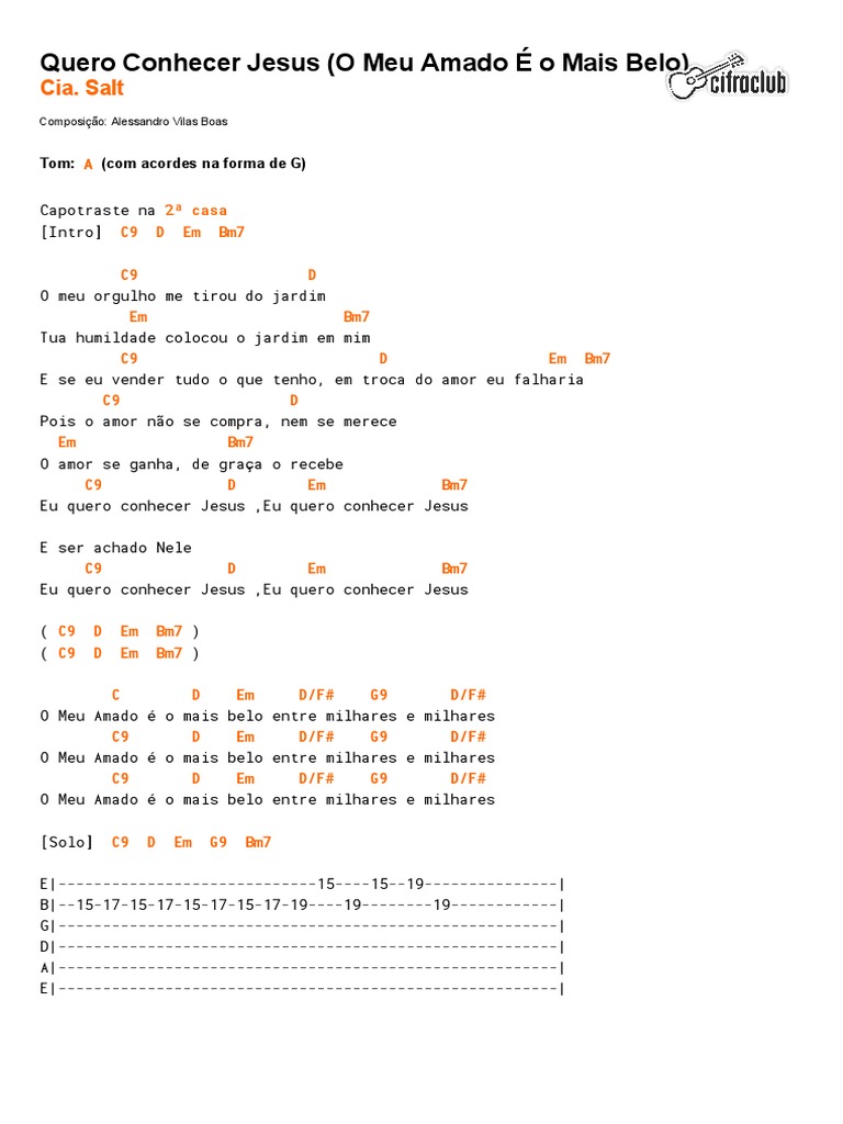 3,955 views, added to favorites 155 times. Aprenda a tocar essa música usando as cifras, tablaturas e versão simplificada com o cifras Meu amado é o mais belo entre milhares e milhares não nasci pra encher o bolso de dinheiro eu não nasci pra encher igreja eu nasci pra conhecer jesus. Eu quero conhecer jesus e ser achado nele. Neste momento, de fato, há muitos que procuram este livro sobre cia salt eu quero conhecer jesus baixar musica, de vários círculos gostam disso. Meu orgulho me tirou do jardim / sua humildade colocou o jardim em mim / se eu vender tudo o que tenho / em troca do amor, eu falharia / pois, o amor não se compra, Talvez agora você esteja interessado no livro cia salt eu quero conhecer jesus baixar musica, aqui exibimos uma variedade de livros interessantes para ler. Posted 1 year ago1 year ago. Salt 7 exibições ,1 páginas. Meu orgulho me tirou do jardim / sua humildade colocou o jardim em mim / se eu vender tudo o que tenho / em troca do amor, eu falharia / pois o amor não se compra, Alessandro vilas boas___assista nossa playlist: Aprenda a tocar a cifra de quero conhecer jesus (o meu amado é o mais belo) (cia. Cia saltquero conhecer jesuspartitura para violino10 versões disponíveis.